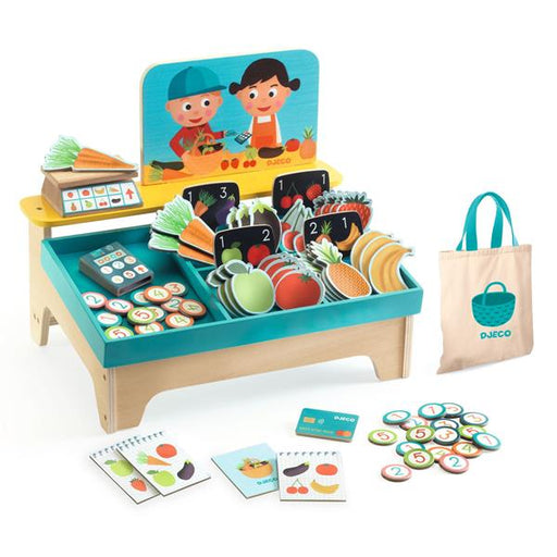 Étal de fruits et légumes pour jouer à vendre ou à acheter. Chacun son rôle! Le vendeur dispose joliment les aliments dans son stand, simule la pes...