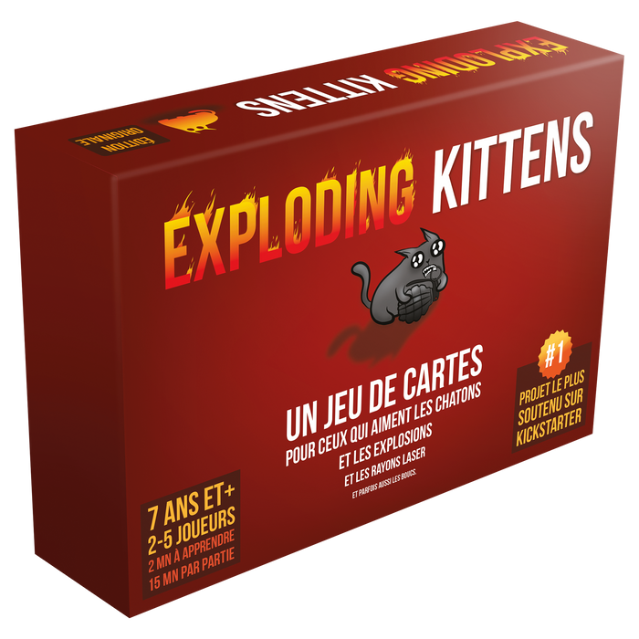 Après un énorme succès sur Kickstarter, le jeu d’ambiance déjanté arrive enfin en français. Vous n’aurez dorénavant plus d’excuse pour vous lancer dans la bataille! Exploding Kittens revisite la célèbre Roulette Russe dans un jeu de cartes où les chatons côtoient d’un peu trop près grenades, missiles nucléaires et torpilles dans un cocktail détonant! À tour de rôle, les joueurs piochent des cartes du paquet jusqu’à ce qu’un joueur révèle un chaton explosif, provoquant sa mort et sa défaite pour la partie en cours. Les autres cartes permettent aux joueurs de se protéger des déflagrations, de forcer les autres à piocher plus ou à regarder les prochaines cartes avant de remélanger le tout. Le joueur qui a réussi à éviter toutes les explosions remporte la partie!